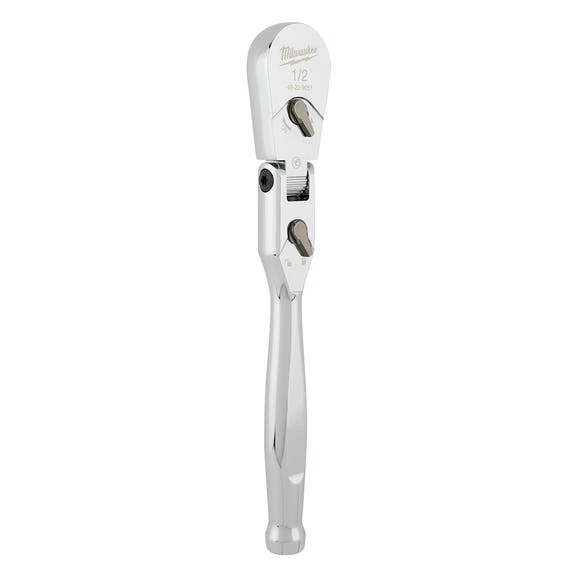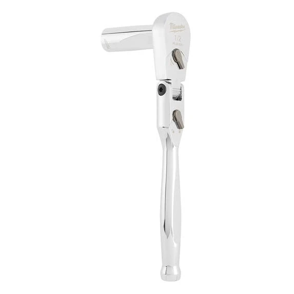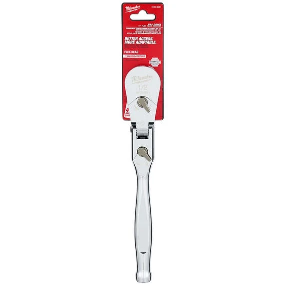 The MILWAUKEE® 1/2” Drive 11” Flex Head Ratchet with a 4⁰ arc swing provides better access and is more adaptable to working in spaces with different angles. The ratchet head can flex to 11 different positions and has a lever to lock the head in place. A slim profile head and flush directional level offer more accessibility.The all-chrome finish makes cleaning the flex head ratchet easy.This ratchet is backed by Milwaukee’s Mechanics Hand Tools Lifetime Guarantee.