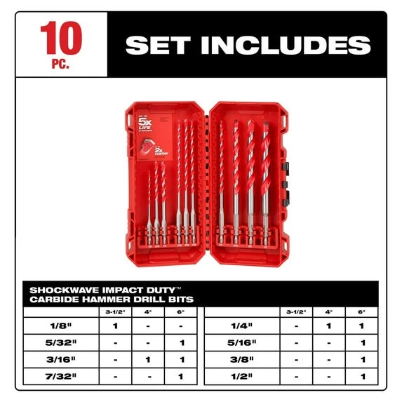 The Milwaukee SHOCKWAVE Impact Duty Carbide Hammer Drill Bits use sharpened carbide to deliver up to 5x longer life in concrete and up to 2x faster drilling into masonry material. Engineered with a precision ground tip, these bits deliver faster starts and less walking in concrete, brick, and block. The wide flute design removes dust faster, reducing heat and delivering more holes per charge. Equipped with a ¼” Hex Shank, the Milwaukee SHOCKWAVE Impact Duty Carbide Hammer Drill Bits are the ideal solution for drilling in masonry materials with both impacts and hammer drills/drivers. Packaged in a medium, double-sided hard case designed for use in the MILWAUKEE PACKOUT Storage System.