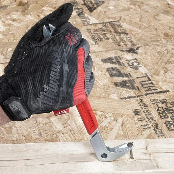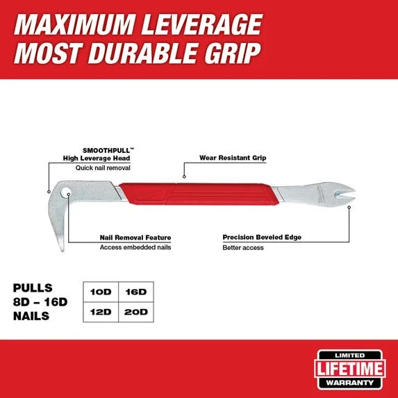 Milwaukee’s 12″ Nail Puller is equipped with our SMOOTHPULL high-leverage head delivering maximum leverage for quick nail removal. The durable grip is wear-resistant for continual comfort over the life of the tool and reduces vibration when the nail puller is struck by a hammer. The beveled edges of the nail puller claws allow for better grip on hard to reach nails. The sharpened claws and integrated nail removal feature on the head of the tool provides you with effective ways to remove embedded nails, reducing damage to surrounding materials. The unique head geometry, combined with optimized 10D-20D nail slots, delivers increased efficiency on the job site.
