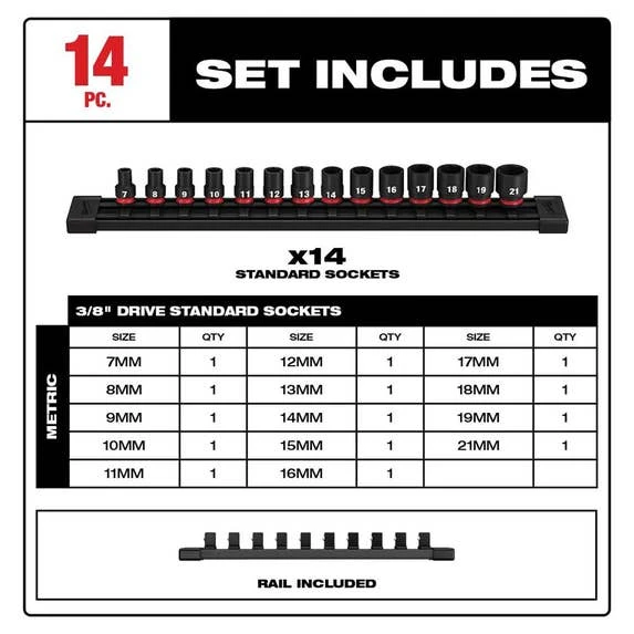 14 Pc. Shockwave Impact Duty 3/8″ Drive Metric Standard 6 Point Socket Set 49-66-7007
