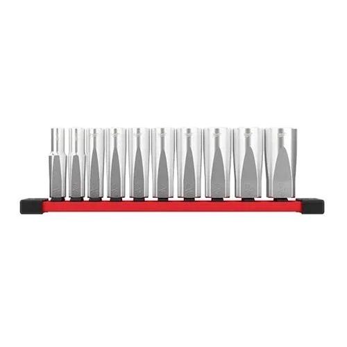 Milwaukee’s 6-Point Sockets with FOUR FLAT™ sides feature an innovative design with four parallel flat sides; which deter rolling and are wrench-compatible. The socket sizes are stamped into the flats providing improved visibility. These deep well sockets have optimized geometry to reduce bolt rounding and stripping. These 10pc sets are stored on a socket rail for tool organization and are backed with our Lifetime Guarantee.
