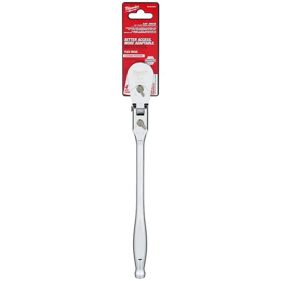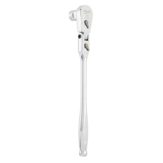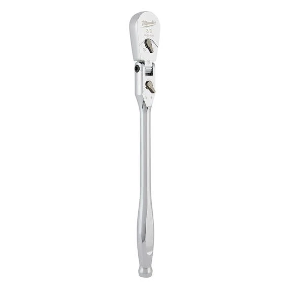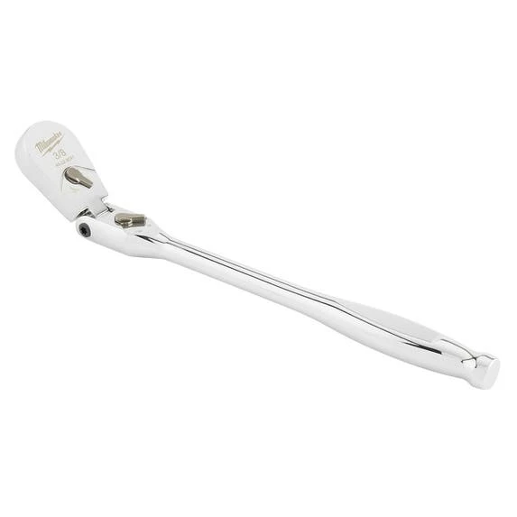 The MILWAUKEE® 3/8” Drive 12” Flex Head Ratchet with a 4⁰ arc swing provides better access and is more adaptable to working in spaces with different angles. The ratchet head can flex to 9 different positions and has a lever to lock the head in place. The extended handle length offers increased leverage for stubborn nuts and bolts, a slim profile design, and a flush directional lever for better accessibility. The all-chrome finish makes cleaning the extended-reach ratchet easy. This ratchet is backed by Milwaukee’s Mechanics Hand Tools Lifetime Guarantee.