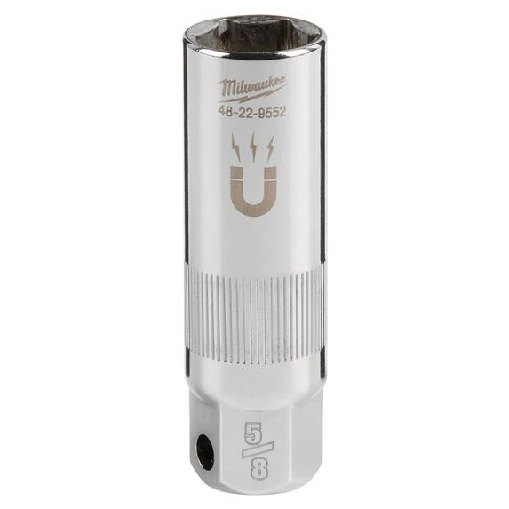 The MILWAUKEE® 3/8″ Drive 5/8″ 6-Point Magnetic Spark Plug Socket features an amplified rare earth magnetic retainer that balances a secure fit with smooth removal of the spark plug from the socket. A precision knurling on the outside of the socket allows for better control when hand tightening or loosening. Both the socket and retainer withstand harsh chemicals commonly found in the garage. Stamped size markings make it easy to identify the size of the socket. The external hex at the base of the socket fits an 11/16” wrench for added control. Milwaukee® Spark Plug Sockets are backed with a Lifetime Guarantee.