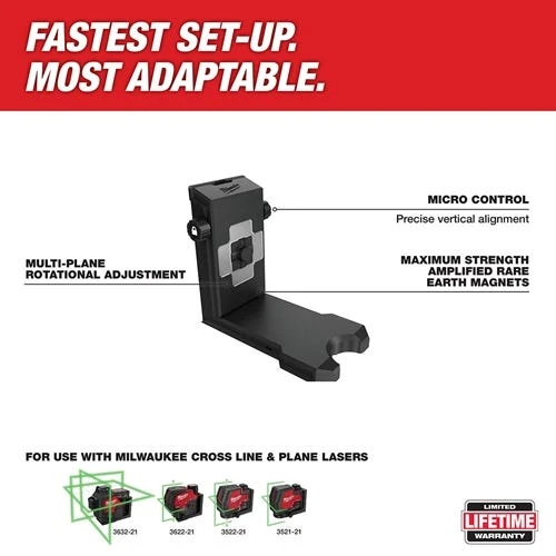 The MILWAUKEE 360° Laser Bracket is an adaptable laser attachment that contributes to the fastest laser setup. With the Multi-Plane Rotational Adjustment; it easily mounts lasers on flat; horizontal; or vertical materials. For use with Milwaukee Cross Line and Plane Lasers.