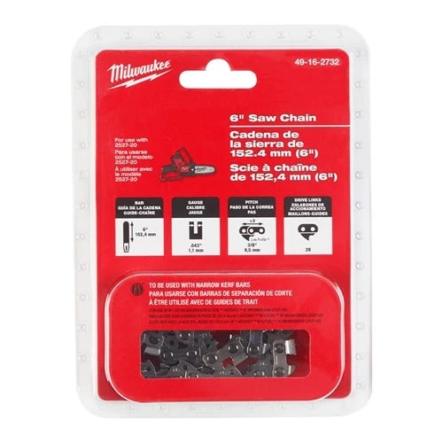 The 6″ Saw Chain is for use with the MILWAUKEE M12 FUEL HATCHET 6″ Pruning Saw (2527-20). The Full House Chain features a cutter on every drive link; which minimizes vibration and delivers clean cuts.