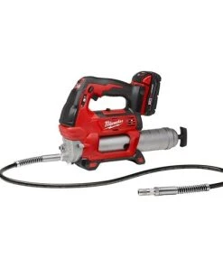 - The M18 Cordless 2-Speed Grease Gun delivers maximum pressure and unmatched versatility; offering an industry leading 10;000 PSI max operating pressure and a patent pending pre-set grease counter that allows service and maintenance professionals to dispense precise amounts of grease. The tools 2-speed design offers users the ability to select between max pressure and max flow rate. Other unique features include an on-board LED light; a lock-on/lock-off trigger; and a plunger rod with markings to gauge how much grease is left in the barrel. The tools stand up design and shoulder strap capability offer user convenience; while limiting fatigue and the 48 flexible hose offers greater accessibility when greasing hard to reach fittings. The new tool is also compatible with a clear barrel accessory (49-16-2646). Powered by an M18 REDLITHIUM Battery pack; this is the industrys only 18V grease gun thats battery is compatible with a system of tools. The kit includes the new multi-voltage charger; so you can charge all M12 and M18 lithium-ion batteries with one charger.