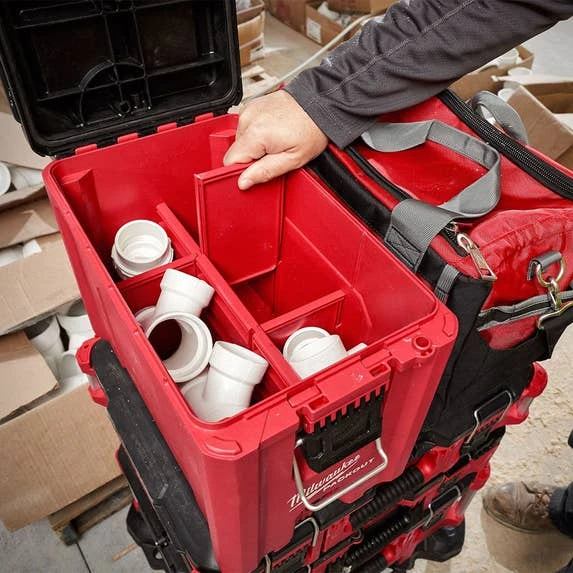 The PACKOUT Compact Tool Box is setup like an old school Ammo Box with similar dimensions (16.3″ 12.87″ 9.8″) and a large front latch with hinges on the back. Very versatile with adjustable dividers and top tray, however remove the dividers and it can even house your M18 FUEL circular saw. IP65 rated for weather protection, lockable, fits well into the PACKOUT system, equal to height of 3 traditional PACKOUTs or 6 slims it’s a nice solution for those taller items. Very high 75 lbs. weight limit, constructed with impact resistant polymers, this is one tough box for storage.