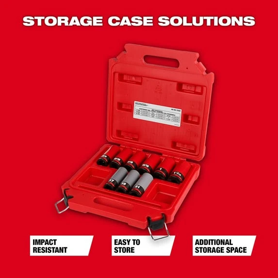 MILWAUKEE® SHOCKWAVE Impact Duty™ 1/2 Drive 6 Point Lug Nut Wheel Sockets feature the Most Durable, Non-Marring Sleeve to protect rims during tire changes. The ARMOR-GUARD™ Sleeve is made with premium, durable plastic for Lasting Protection against cracking or shredding during wheel installation and removals. The sockets are thin-walled for easy access in tight wheel assemblies and feature a non-marring plastic insert to protect lug nuts during use. The sleeves are color-coded, Gray for Metric sizes and Red for SAE sizes, to ensure easier socket selection while also featuring stamped & ink filled sizes for the Boldest, Longest Lasting markings. Milwaukee sockets are engineered with high strength forged steel for optimized performance in heavy-duty applications. The customizable Socket Rail comes with removable end caps to add or take off socket clips for optimal storage. The dual-hole design and ring groove allow for easy socket attachment and removal. MILWAUKEE® SHOCKWAVE Impact Duty™ Lug Nut Wheel Sockets are optimized for use with 1/2″ drive impact wrenches, drivers, ratchets, and adapters and meet ASME industry standards for thin-walled sockets.